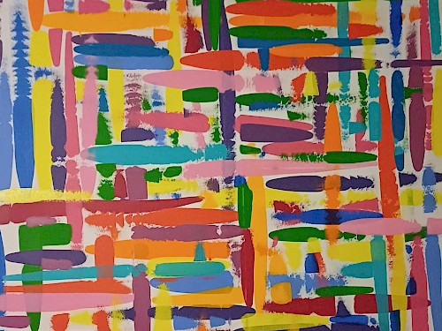 Seine Bilder strahlen Intensität aus: Sie erinnern an Pop-Art, sind oft abstrakt und voller überraschender Elemente, manchmal tauchen Figuren auf, manchmal reduziert er Farbe und Form.