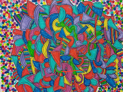 In seiner Wohnung stapeln sich inzwischen die Werke – lebendig, vielfältig und voller Energie. Dabei entstehen bis zu drei Bilder an einem Tag, ganz gleich in welchem Format. Gunzo arbeitet nicht nach Lehrplan, sondern nach Inspiration: Er hat sich bewusst gegen eine klassische Kunstausbildung entschieden und lässt seine Visionen aus dem Alltag wachsen – beim Spaziergang, im Gespräch oder wenn er einfach seine Gedanken ordnet.