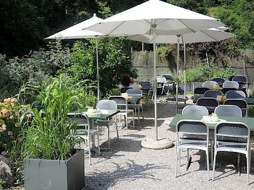 Mit Sonnenschirmen, Kräutergarten, Birnenspalier und Blick in den nahen Wald lädt unsere Gartenwirtschaft zu gemütlichem Verweilen ein. Sei das im Alltag oder anlässlich Ihres Privatanlasses in unseren Räumlichkeiten. Auf Anfrage kann die Gartenwirtschaft bei einer Raummiete mitbenutzt werden.