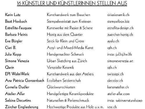 Am Sonntag, den 30. November 2025, findet im Quartiertreff Hirslanden unser traditioneller Kunsthandwerk-Markt statt. 16 talentierte Künstler stellen ihre einzigartigen Werke aus und bieten diese zum Verkauf an – eine wunderbare Gelegenheit, besondere Kunstobjekte zur Weihnachtszeit zu erwerben.